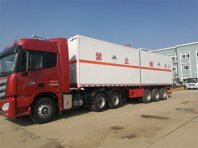 9类危险品厢式半挂运输车厢体为飞翼车厢,厢体两边侧开为四开门,厢后双开门,方便装卸!有需要的客户可以预定了!